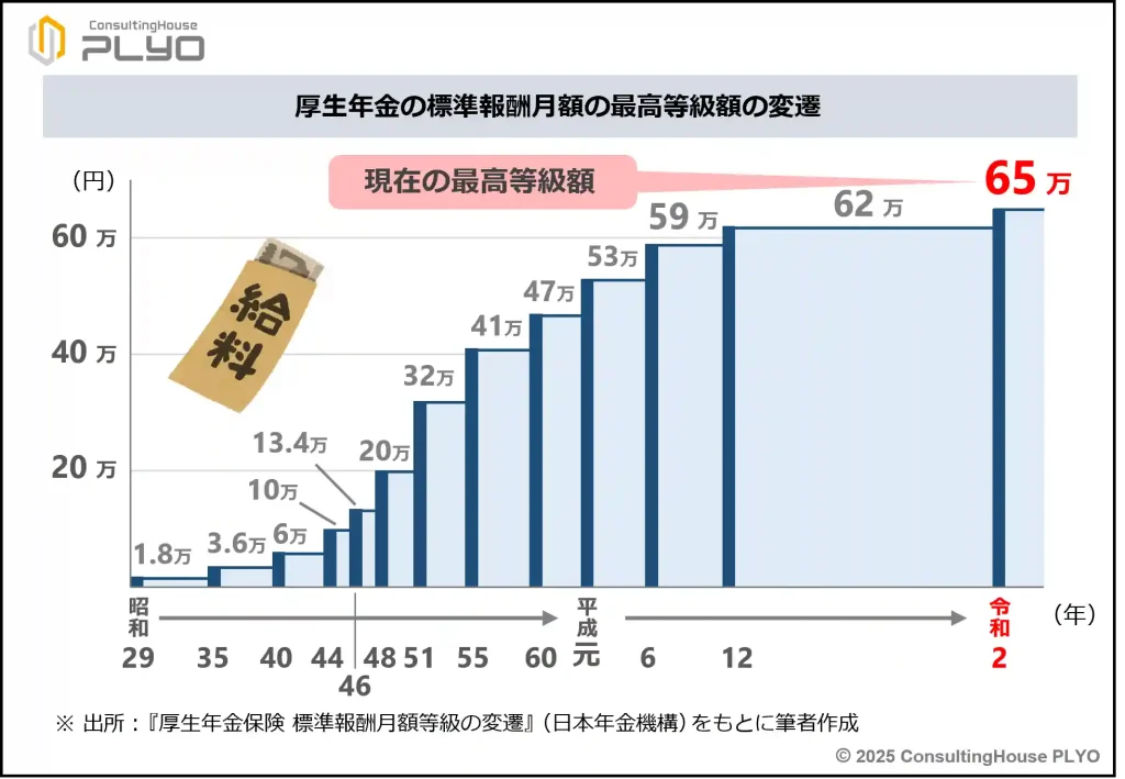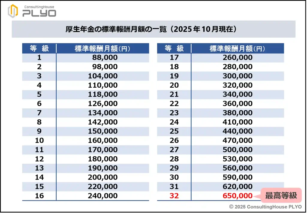 2025(令和7)年10月現在、厚生年金の標準報酬月額の最高等級は前述のとおり32等級(65万円)で、対象者は給料額が63.5万円以上の加入者です。