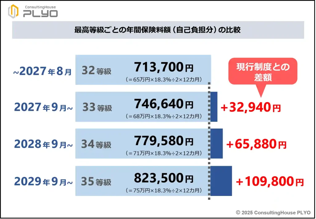 標準報酬月額の新しい最高等級として2027年9月から33等級(68万円)が、2028年9月から34等級(71万円)が、2029年9月から35等級(75万円)が新設される。