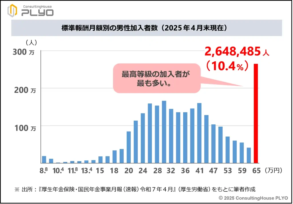現在、標準報酬月額の中で最も加入者が多い等級は32等級(65万円)で、全加入者の7%程度が該当しています(厚生年金保険・国民年金事業月報(速報)令和7年4月/厚生労働省)。