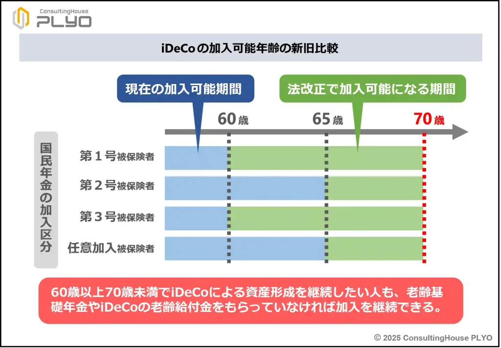 このような事情から、「iDeCoで資産形成を継続したい60歳以上70歳未満の人」が新たにiDeCoに加入できる法改正が行われたものです。