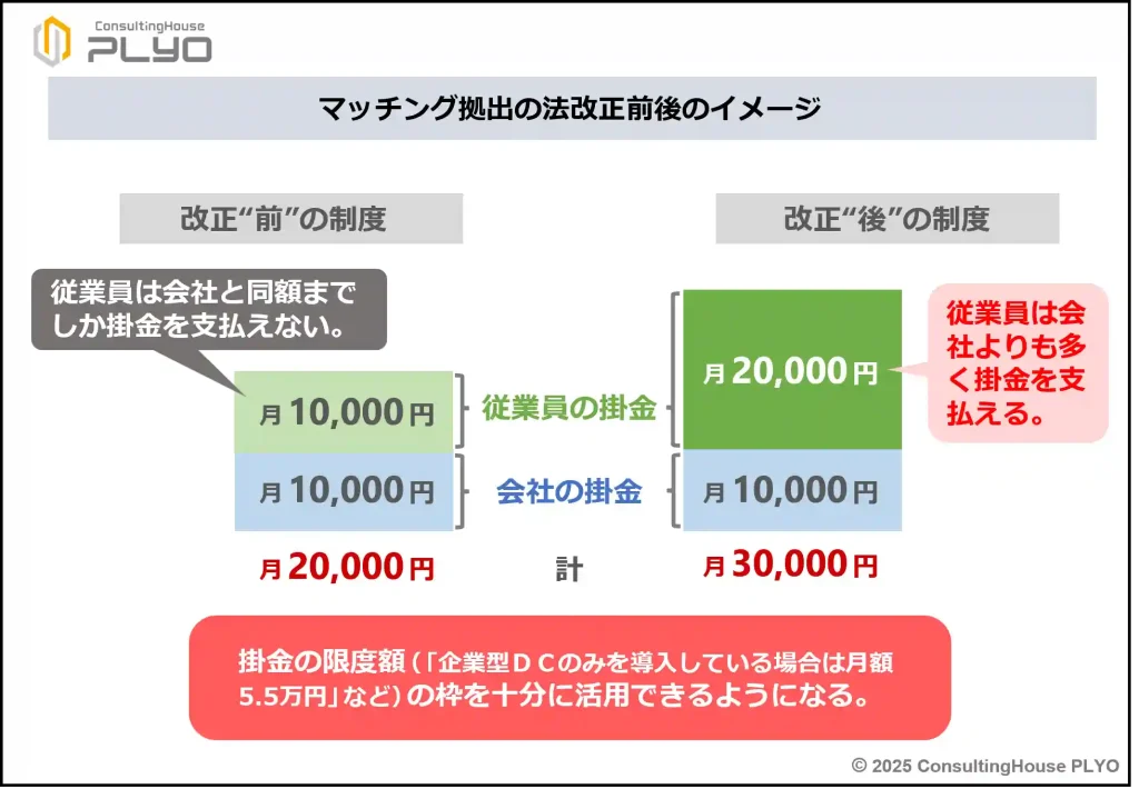 そこで、「従業員の掛金額は会社の掛金額を超えられない」という制限を撤廃し、月額5.5万円などの限度額の枠を十分に活用できるようにしたものです。