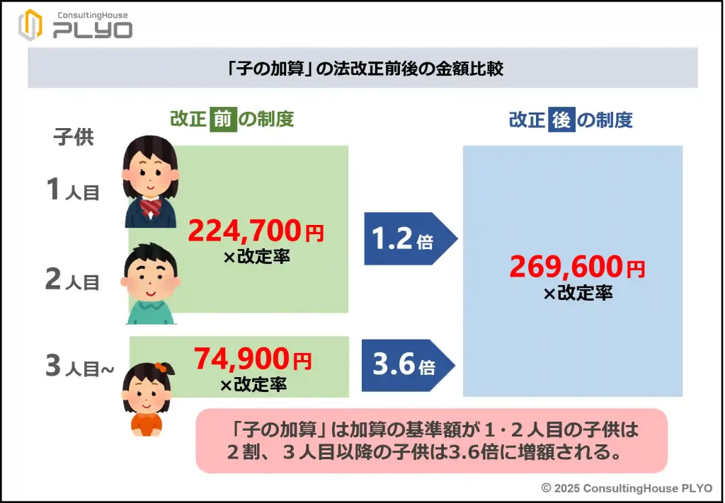 「子の加算」は1人当たりの金額が出生順にかかわらず同額となり、また、2割増額もされる。さらに、現在は「子の加算」がない年金にも加算が行われる。