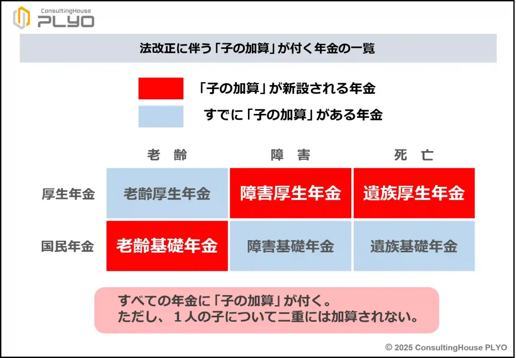 その結果、老齢・障害・遺族のいずれの年金についても、国民年金側と厚生年金側の両方に「子の加算」が付くことになります。