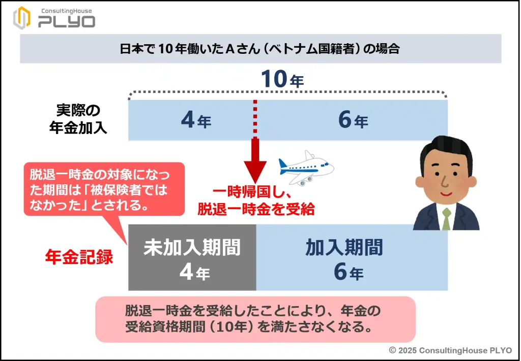 その結果、老齢年金をもらうのに必要な加入実績を残せないまま母国に帰るという事態に陥ってしまいがちです。