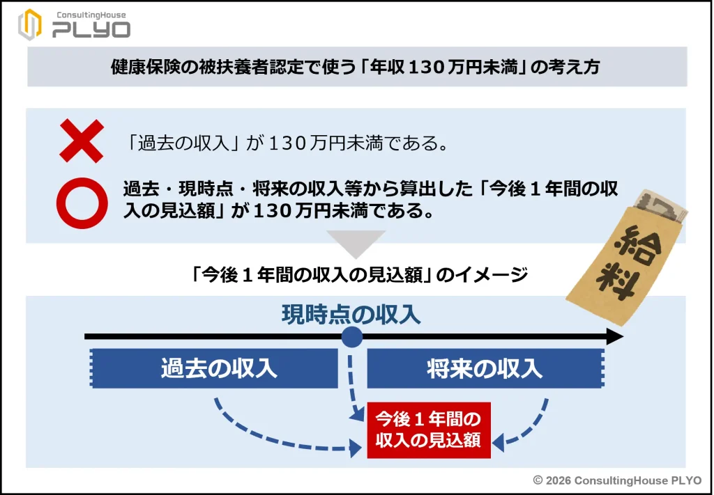 健康保険の被扶養者の認定は過去の収入、現時点の収入、将来の収入などから「今後1年間の収入の見込額」を算出し、基準額未満となるかどうかで判断される。