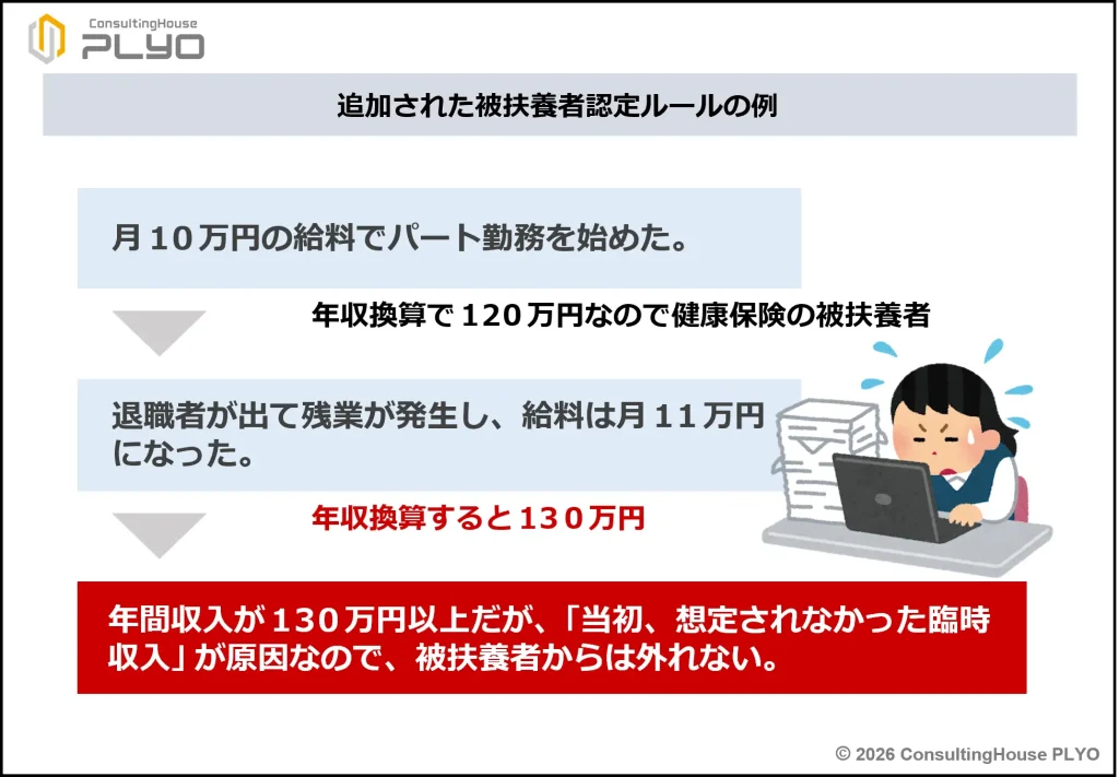 2026年度から追加された被扶養者認定ルールにより、パート勤務者にとっては「この残業依頼を受けると130万円以上になってしまう」などの心配が一定程度、解消されることになるようです。