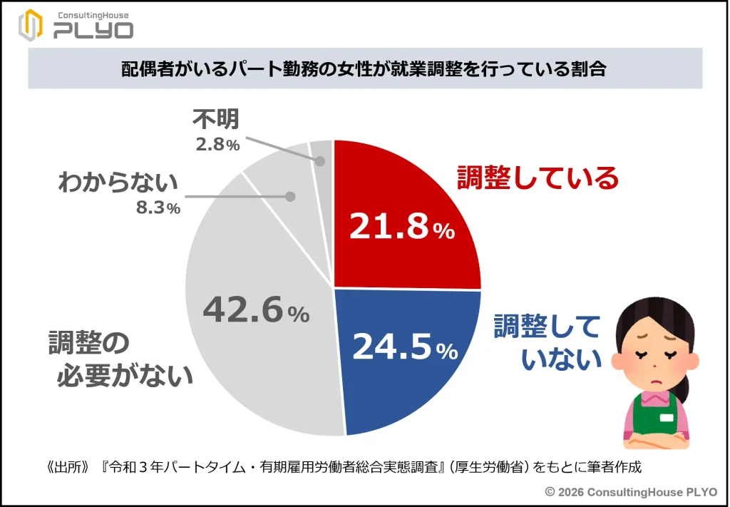 パート勤務者の就業状況について調査した『令和3年パートタイム・有期雇用労働者総合実態調査』(厚生労働省)によると、配偶者がいるパート勤務の女性が過去1年間に就業調整をしたことがある割合は21.8です。