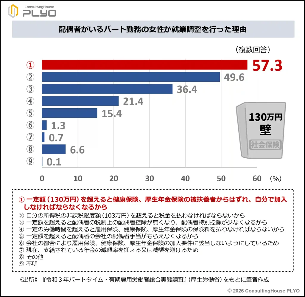 また、配偶者がいるパート勤務の女性が就業調整を行った理由では、最も多かった回答が「一定額(130万円)を超えると健康保険、厚生年金保険の被扶養者からはずれ、自分で加入しなければならなくなるから」57.3です。