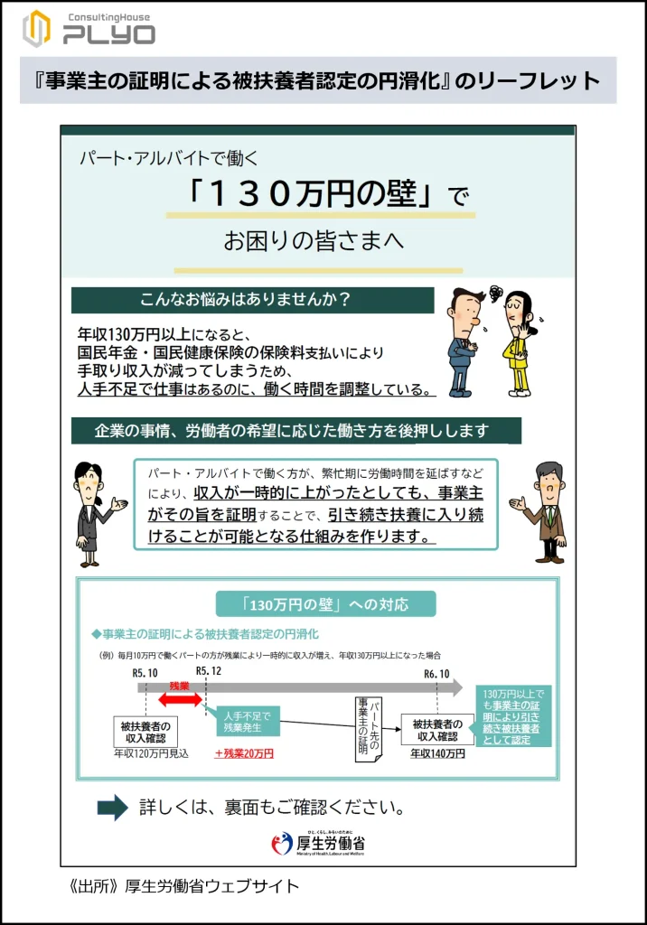 上記4つの取り組みのうち3番目の『事業主の証明による被扶養者認定の円滑化』は、年収130万円を就業調整の基準としている人を想定した対策です。