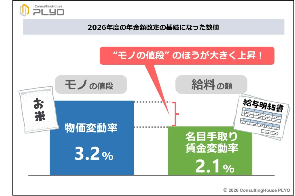 物価変動率のほうが名目手取り賃金変動率よりも大きかったため、2026年度の年金額改定は名目手取り賃金変動率2.1%をもとに行われることになった。
