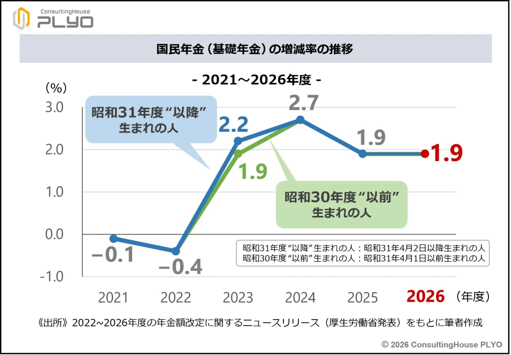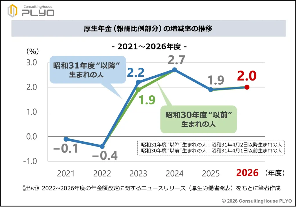 - 2026年度は国民年金(基礎年金)が1.9%、厚生年金(報酬比例部分)が2.0%の増額である。