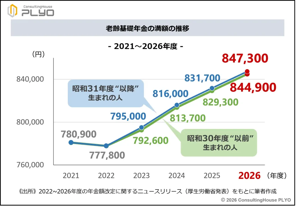 2026年度の老齢基礎年金の満額は昭和31年度以降生まれで847,300円であり、これまでの最高額を更新した。