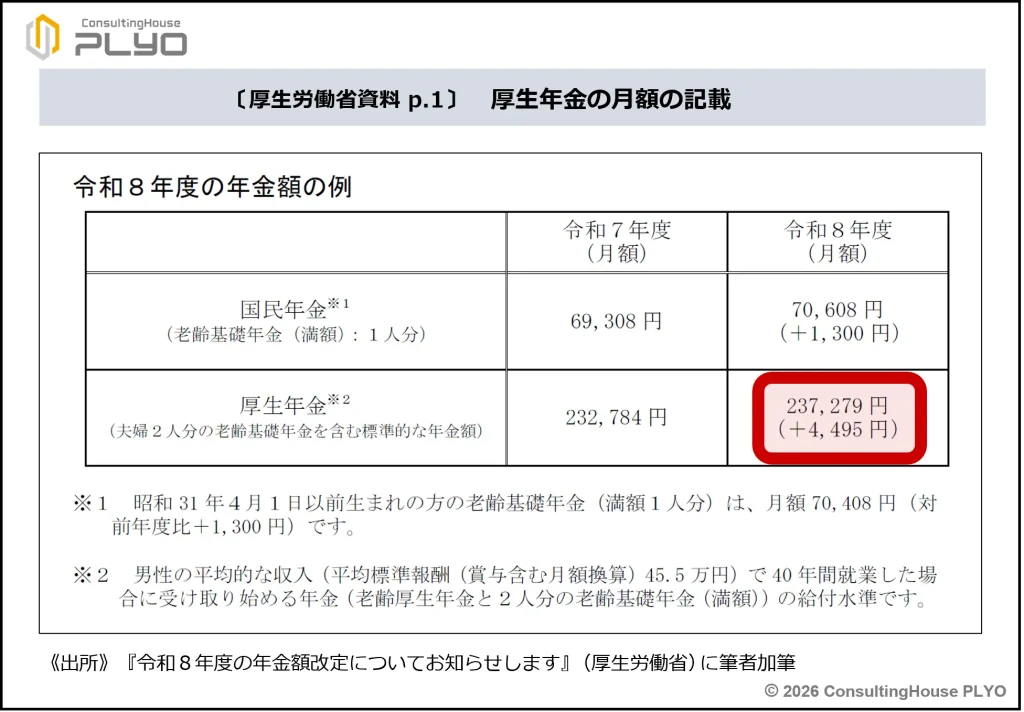 資料によると、2026(令和8)年度には国民年金(基礎年金)の額は1.9%の引上げが、厚生年金(報酬比例部分)は2.0%の引上げが行われるとのことです。