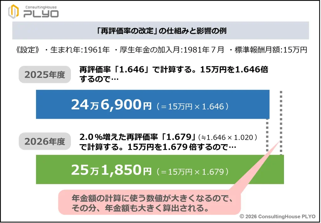 しかしながら、2026(令和8)年度は厚生年金の報酬比例部分の増額率が2.0%と決まりましたので、「1.646」という再評価率も2.0%増やされることになります。