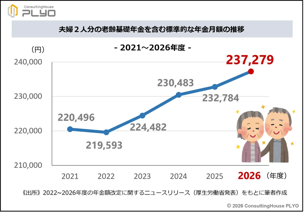 厚生労働省が発表した前述の資料によると、夫婦2人分の老齢基礎年金を含めた標準的な年金額は月237,279円で前年度より4,495円増とのことです。